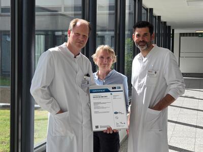 Wir gratulieren herzlich dem Team unseres Viszeralmedizinischen Tumorzentrums, das sich mit großer Bravour der wiederholten Rezertifizierung durch den TÜV Hessen gestellt und diese erfolgreich absolviert hat. Unser Dank gilt allen Beteiligten, die sich im vergangenen Jahr mit Hochdruck um das hervorragende Audit gekümmert haben. Mit Zertifikat vom 29.08.2025 wird die qualitativ hochwertige Arbeit des gesamten Behandlungsteams im Viszeralmedizinischen Tumorzentrums unter der Leitung der Chefärzte Prof. Dr. Karsten Junge (Allgemein-, Viszeral- und Minimalinvasive Chirurgie) und Prof. Dr. Jens Tischendorf (Innere Medizin und Gastroenterologie) unterstrichen.